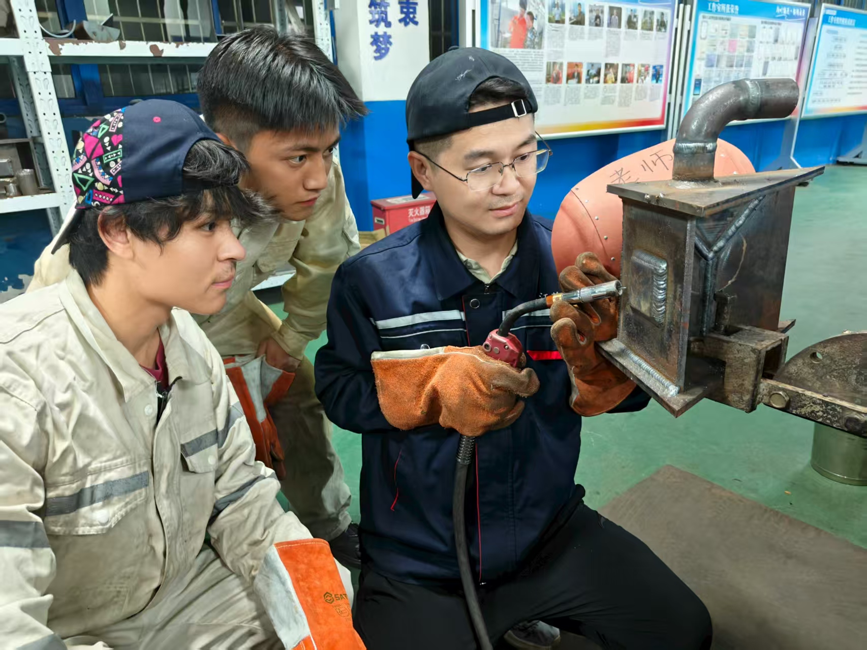 优异成绩的背后,离不开技能大师工作室领办人张强勇与李德印两位老师的辛勤付出与专业指导。备赛期间,两位老师分工协作,日夜奋战,主动放弃暑假及一切节假日休息时间,全力投入选手的技能训练工作。他们系统规划训练内容,涵盖手工电弧焊、气体保护焊、氩弧焊、机器人焊接、焊接虚拟仿真、远程论文比赛项目。技能大师工作室以高标准、严要求推动集训工作高效开展。张强勇老师凭借多年大赛指导经验,精准把脉每位选手的技术特点,制定个性化强化方案;李德印老师则注重工艺细节与心理调控,帮助选手在高压环境下稳定发挥。他们不仅传授技艺,更以敬业精神和职业素养深刻影响着学生,真正体现了“师者,传道授业解惑”的崇高境界。